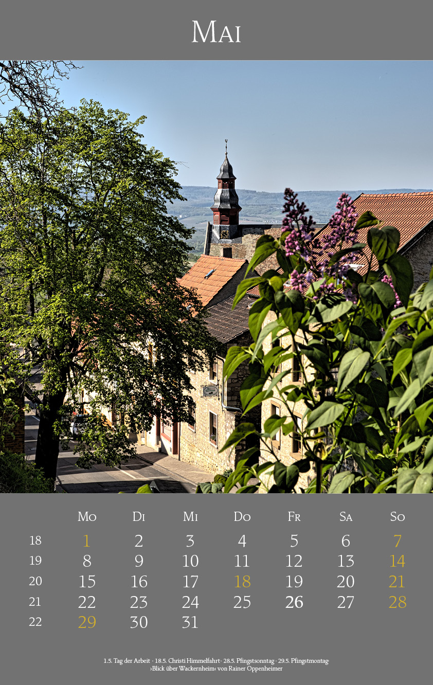 Das Motiv für den Monat Mai stammt von Rainer Oppenheimer aus Ingelheim. Das Motiv ›Blick über Wackernheim‹ zeigt einen Blick über einen der jüngeren Ortsteile Ingelheims in Richtung Rheingau.