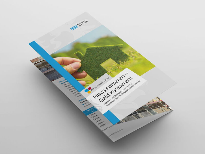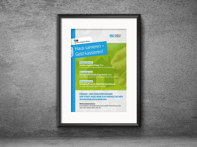 Für die Bewerbung des ›Förder- und Bonusprogramms zur energetischen Wohngebäudesanierung‹ wurden ein Plakat und ein 12-seitiger Informationsprospekt, für die Bewerbung klimafreundlicher Mobilitätsangebote ein Folder von INCOM entwickelt und hergestellt.