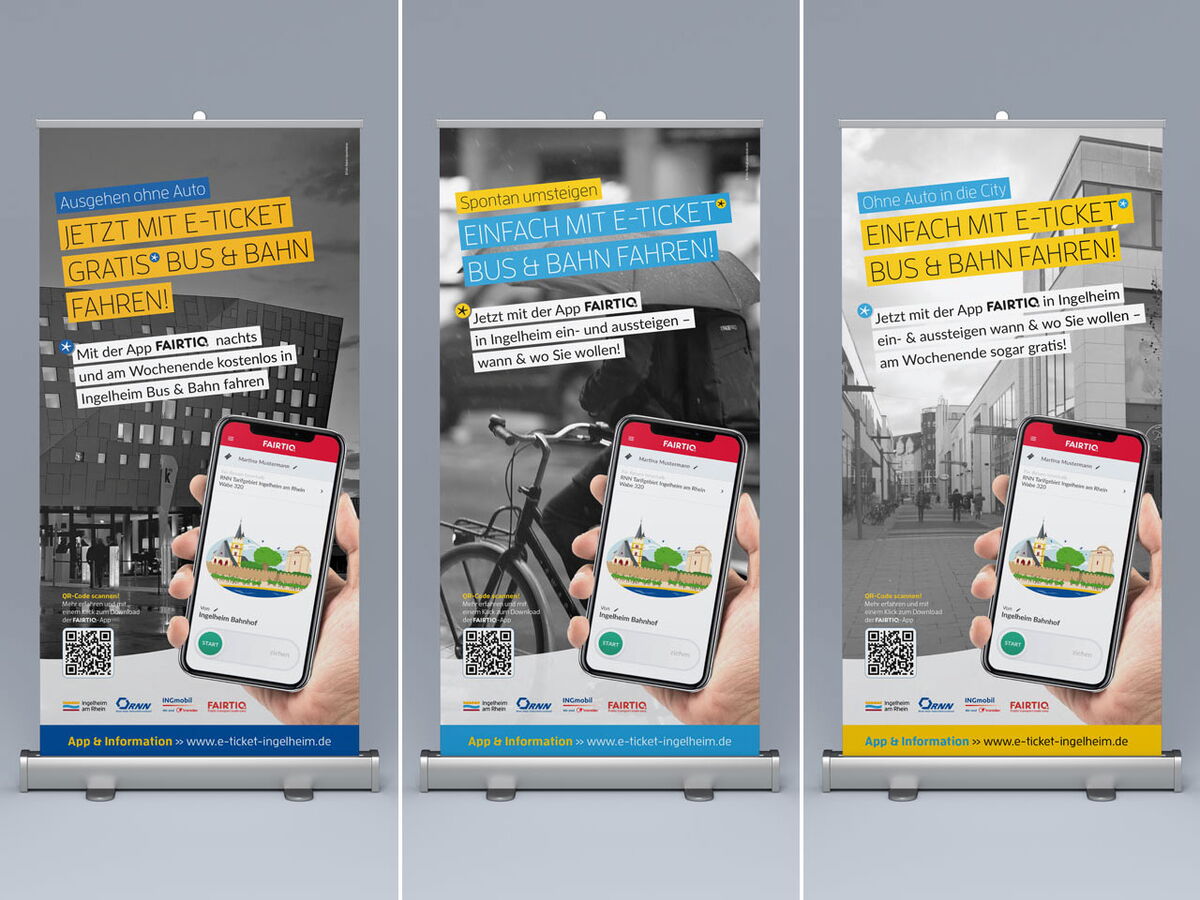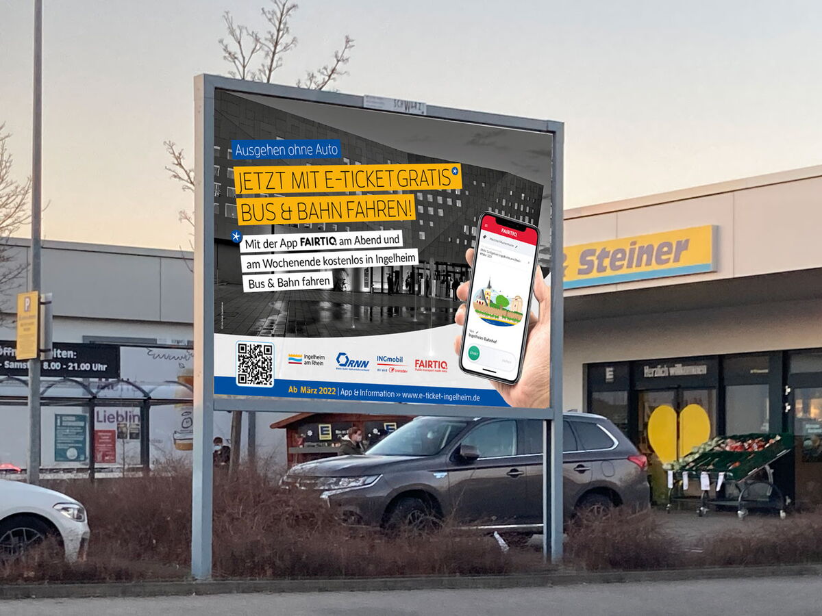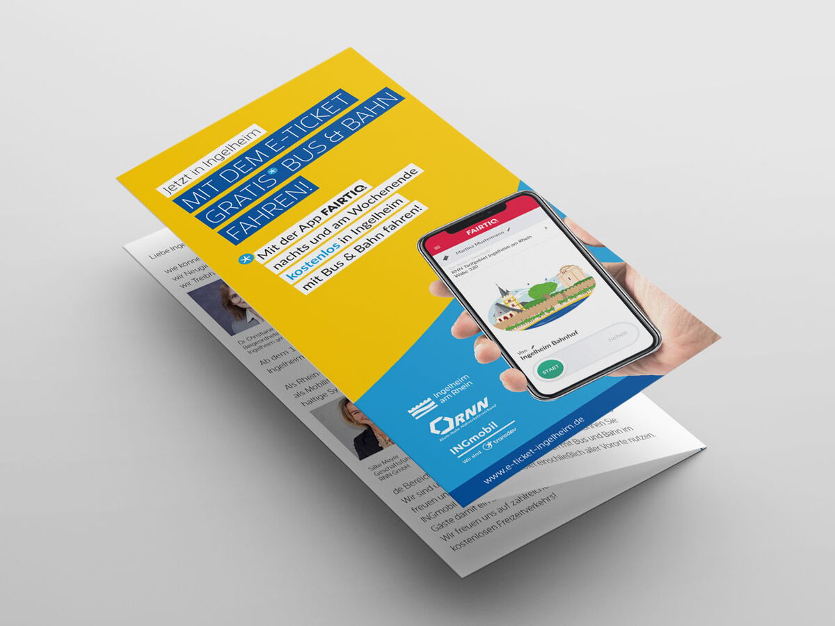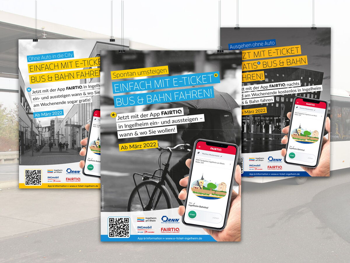 Realisiert wurden Anzeigen, Plakate Großfläche, Plakate A3, Informationsfolder, Buswerbung, Bahnhofswerbung, Bodenaufkleber, Rollups & Theke Infostand, Social Media Posts und Presseinformationen. Zudem wurde mit www.e-ticket-ingelheim.de eigens eine Website zu diesem Thema erstellt.